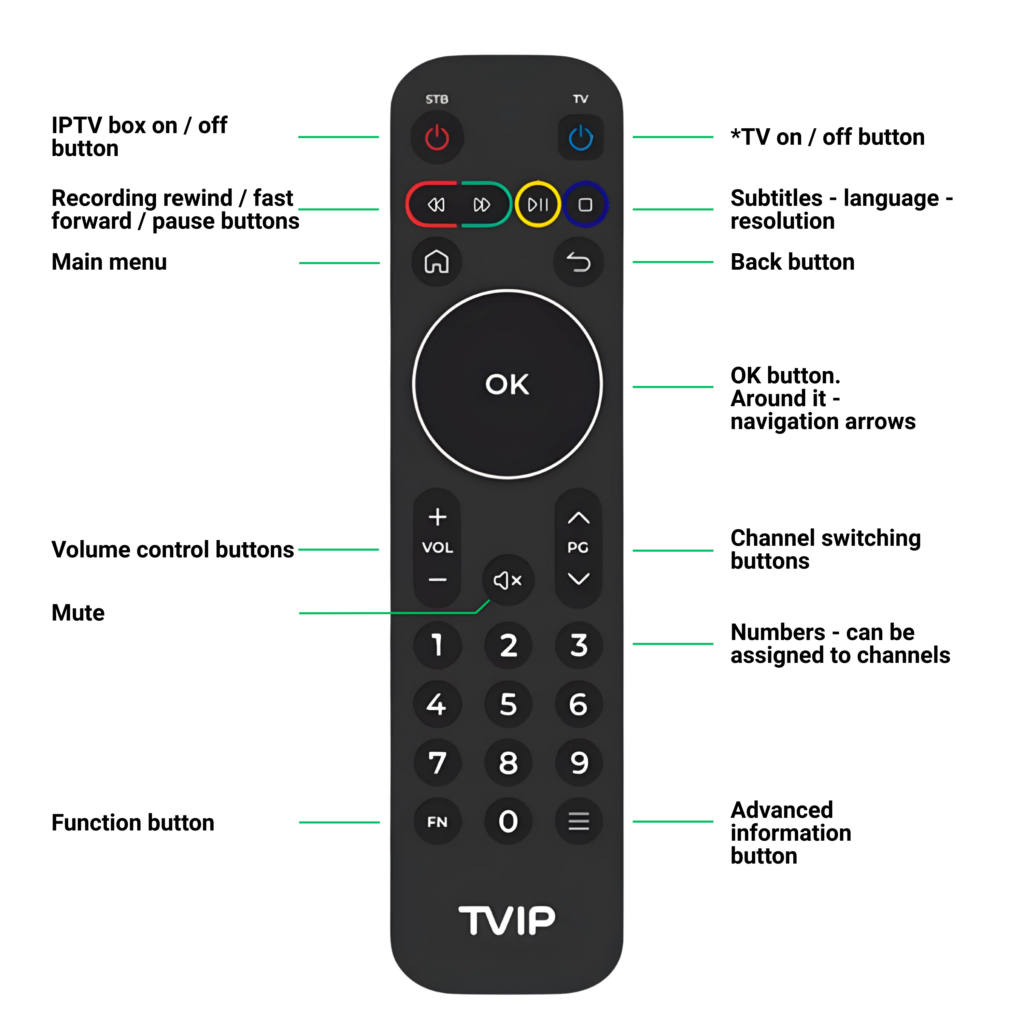 IPTV Box Instructions TVIP-705 Power buttonRemote control statusPower on/off statusIR sensorMicroSD card slotUSB portUSB portIR portAV adapter portHDMI portEthernet portPower cord connector TVIP 705 box package IPTV boxRemote controllerHDMI cableBatteriesPower cordBoxTVIP 705 remote controller button layout